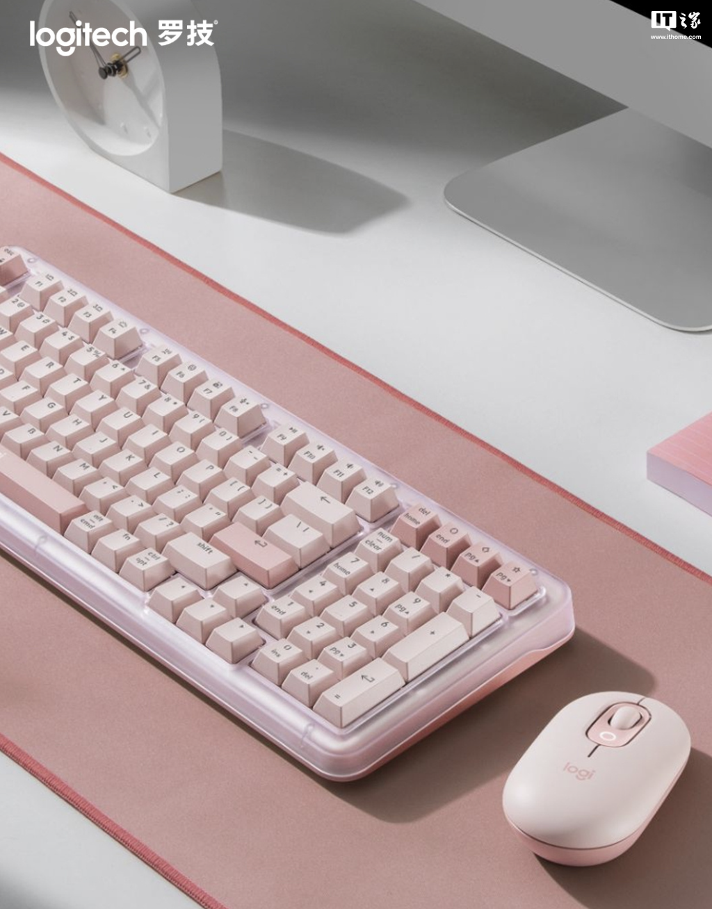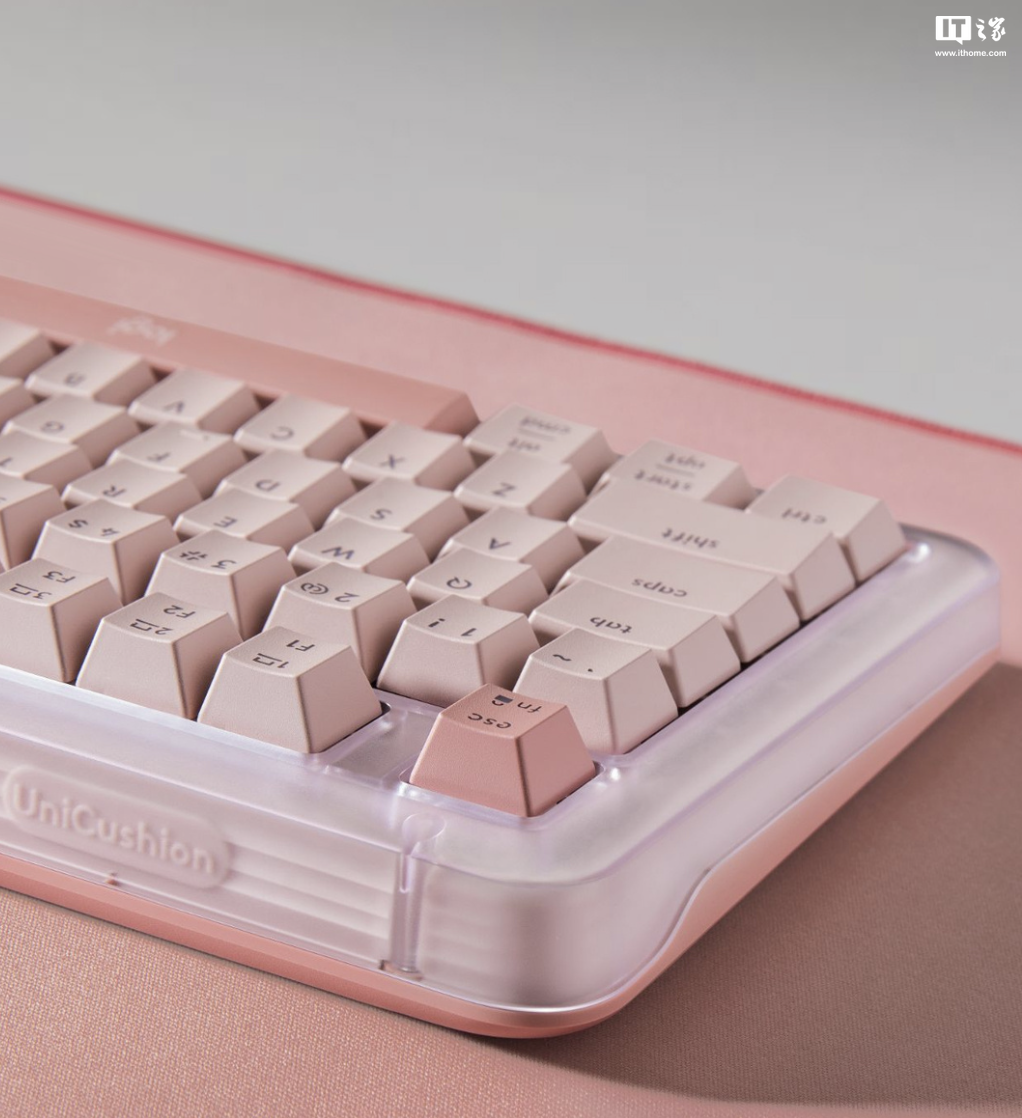 据罗技介绍,这款键盘整体使用玫瑰粉配色,使用 98 键配列,带有白色背光,使用透光 PBT 键帽,采用大中底 UniCushionGasket 垫片结构,配备轻音轴,支持热插拔、全键无冲。