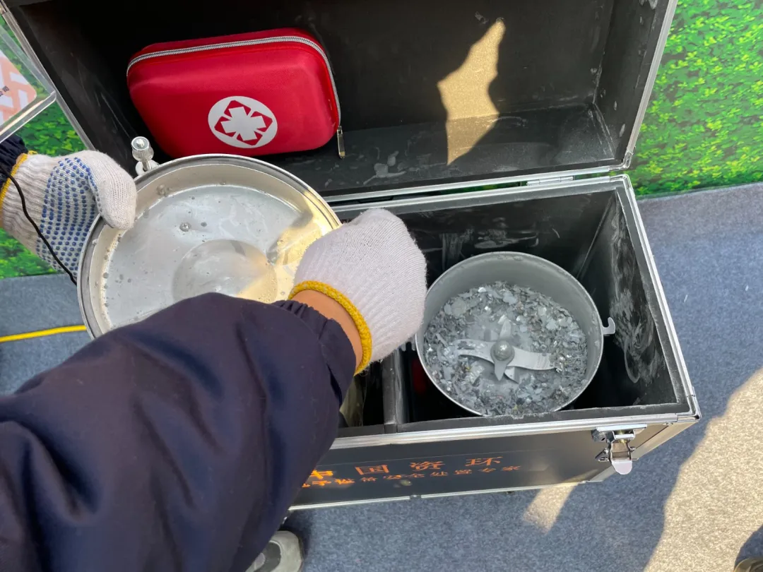 选择“面对面”见证破碎服务的消费者,可亲眼看到手机的处置过程,破碎后的物料则被工作人员用密封袋包装安全存放,统一通过中国邮政 EMS 物流运输至中国资环位于汕头贵屿的电器电子循环利用基地进行资源化利用。