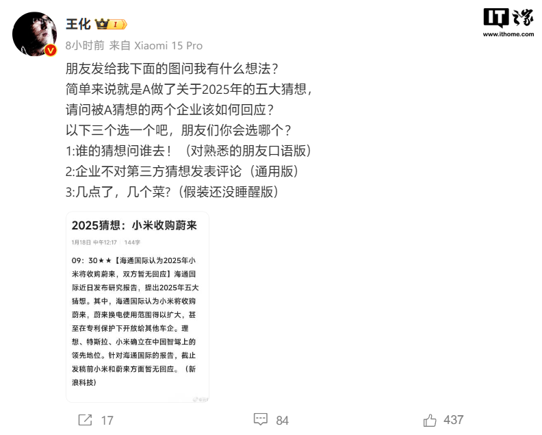 王化:朋友发给我下面的图问我有什么想法?简单来说就是 A 做了关于 2025 年的五大猜想,请问被 A 猜想的两个企业该如何回应?以下三个选一个吧,朋友们你会选哪个? 1.谁的猜想问谁去!(对熟悉的朋友口语版) 2.企业不对第三方猜想发表评论(通用版) 3.几点了,几个菜?(假装还没睡醒版)