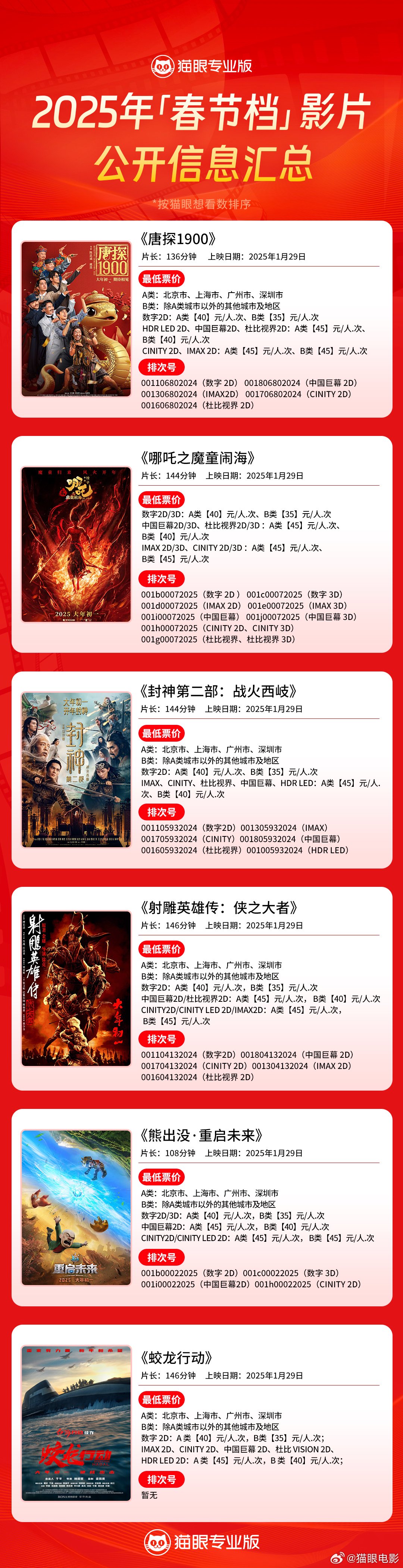 电影《射雕英雄传:侠之大者》《哪吒之魔童闹海》《封神第二部:战火西岐》分列春节档预售票房榜前三。当前 2025 春节档电影发行通知已全部释出: