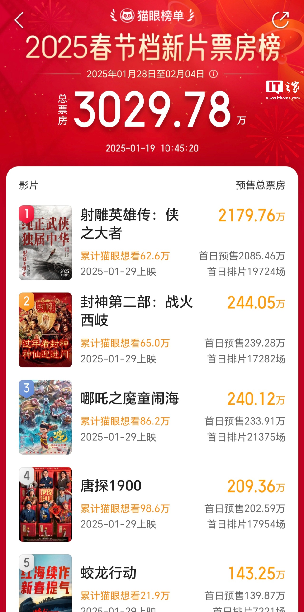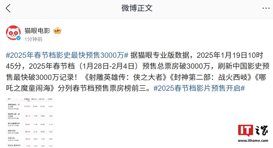 IT之家 1 月 19 日消息,据猫眼专业版数据,2025 年 1 月 19 日 10 时 45 分,2025 年春节档(1 月 28 日-2 月 4 日)预售总票房破 3000 万,刷新中国影史预售最快破 3000 万记录。