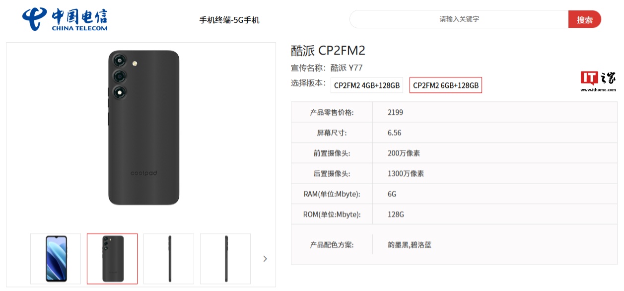 IT之家 1 月 19 日消息,型号为“CP2FM2”的酷派 Y77 手机现身中国电信终端产品库,相关页面显示产品零售价格 1899 元起。