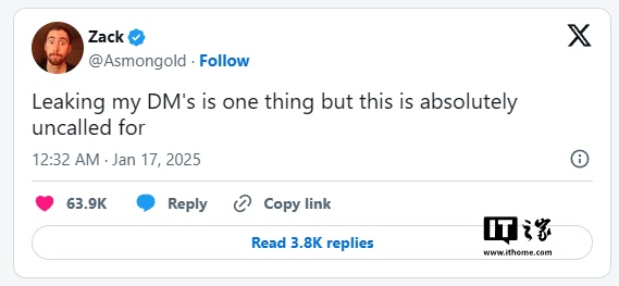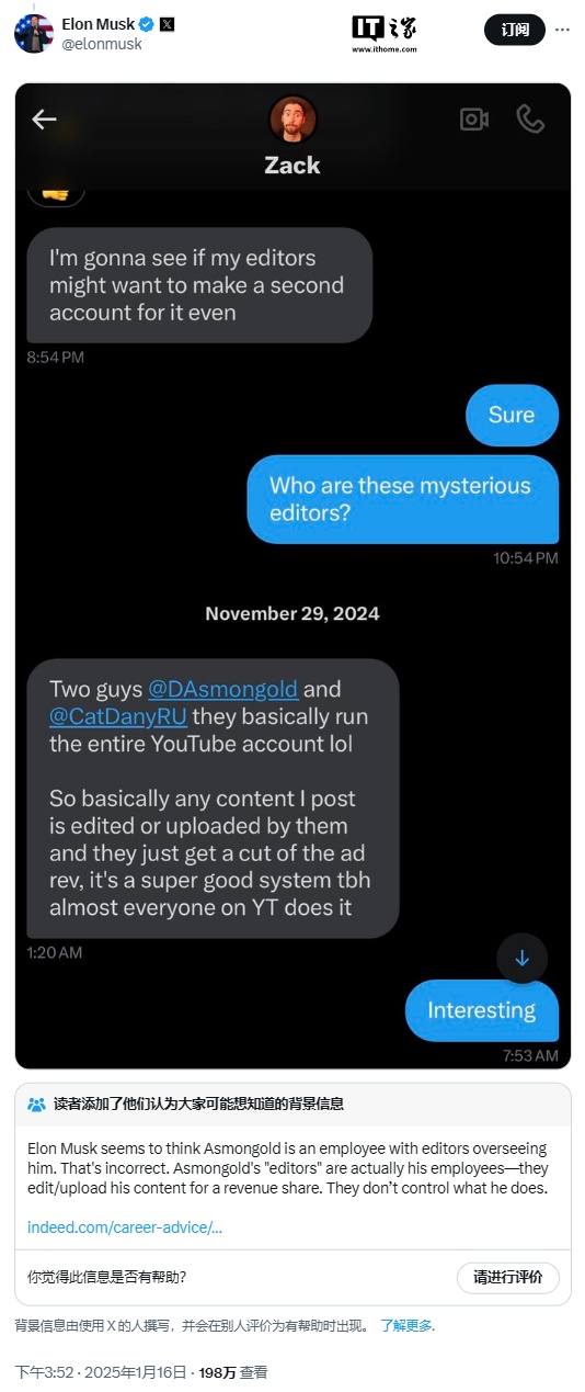 1 月 15 日,马斯克在 X 上取消了对 Asmongold 的关注。1 月 16 日,马斯克更是在 X 上对 Asmongold 发起猛烈抨击,称其行为看似独立,实则需向“老板”请示,并分享了两人之间的私信记录。Asmongold 在私信中提到自己有编辑负责剪辑直播内容。然而,X 的社区注释功能澄清了这一误解,指出 Asmongold 的“编辑”实际上是他的员工,负责剪辑和上传内容以分享收入,而非控制他的行为。