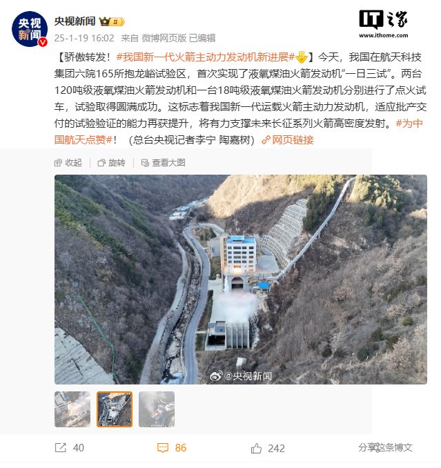 IT之家 1 月 19 日消息,据央视新闻报道,今日中国航天科技集团六院 165 所抱龙峪试验区成功实现了液氧煤油火箭发动机“一日三试”。这是国内首次实现两型液氧煤油火箭发动机“一日三试”,标志着我国新一代运载火箭主动力发动机适应批产交付的试验验证的能力再获提升,将有力支撑未来长征系列火箭高密度发射。