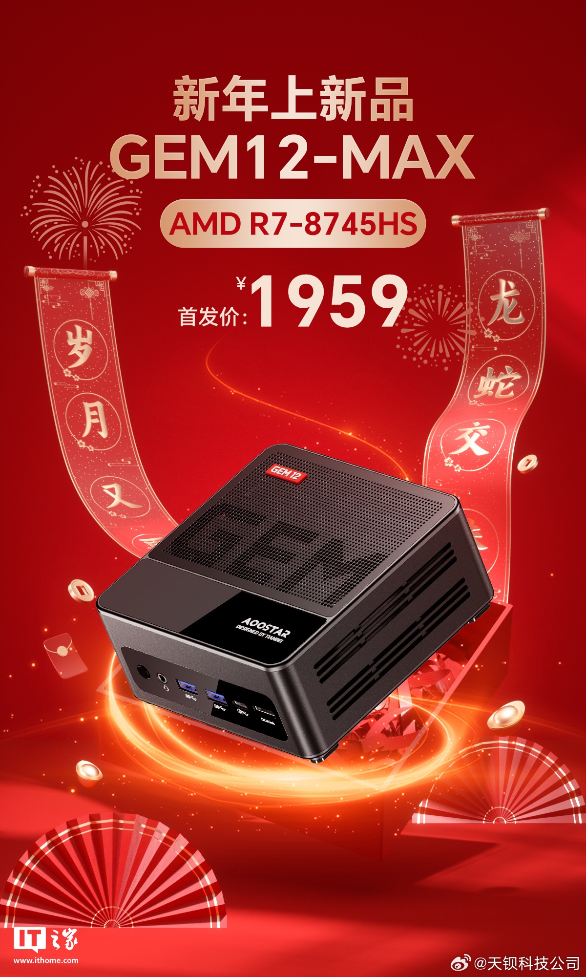 IT之家 1 月 19 日消息,天钡 GEM12 Max 迷你主机搭载 AMD 锐龙 R7-8745HS 处理器,将于 1 月 20 日零点开售,售价 1959 元起。