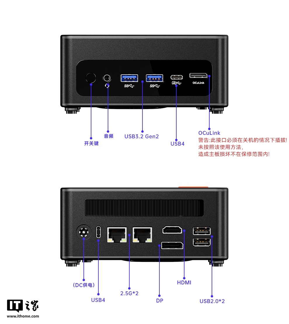 天钡 GEM12 Max 迷你主机前置有 1×3.5mm 音频接口、2×USB 3.2 Gen2、1×USB4、1×OCuLink 接口;后置 1×USB4、2×2.5G 网口、1×DP、1×HDMI、2×USB 2.0 接口,采用 DC 接口供电。