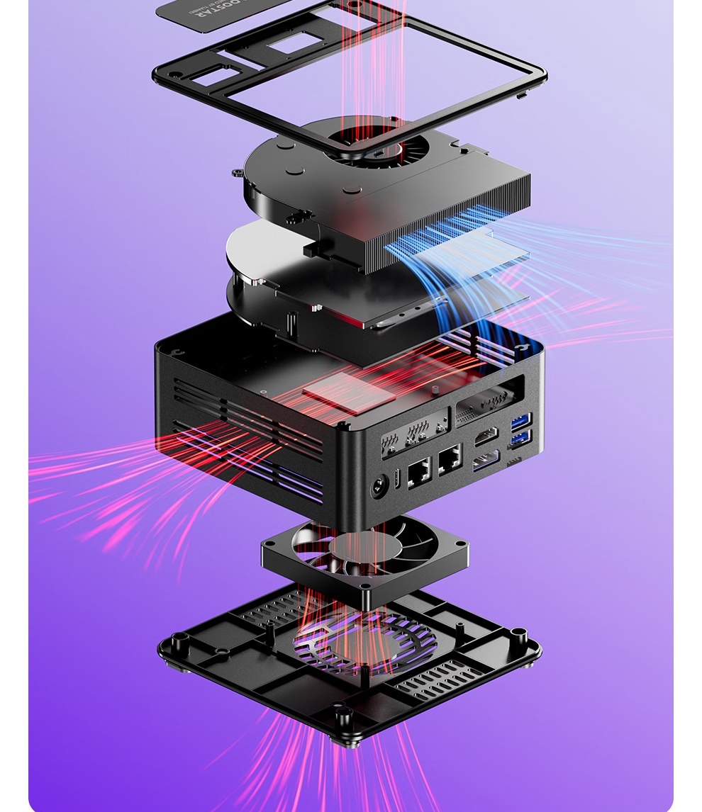 天钡 GEM12 Max 迷你主机可安装双 2280 固态硬盘;支持双通道 DDR5 5600MHz 内存,单条最高支持 64GB;支持 Wi-Fi6,搭载双 2.5G 网口。