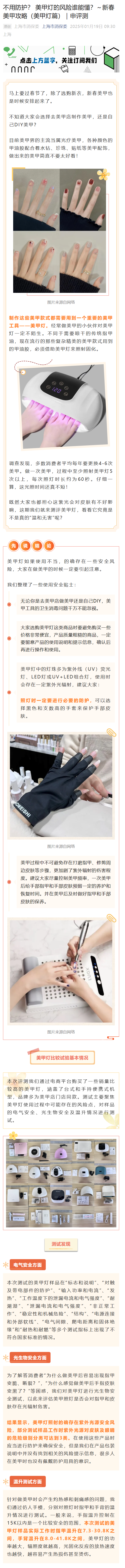IT之家注意到,上海市消保委今日发布评测文章,对 20 款美甲灯进行检测发现,这些产品都不符合国家电气安全标准,而且多个美甲灯多个测试指标不符合国标规定。更为严重的是,20 款美甲灯均存在紫外光源安全风险,其中 18 款样品工作时,紫外光源对皮肤及眼睛的危险级别达到高危险级别,2 款为中度危险级别。
