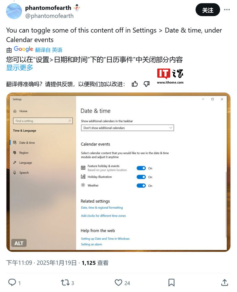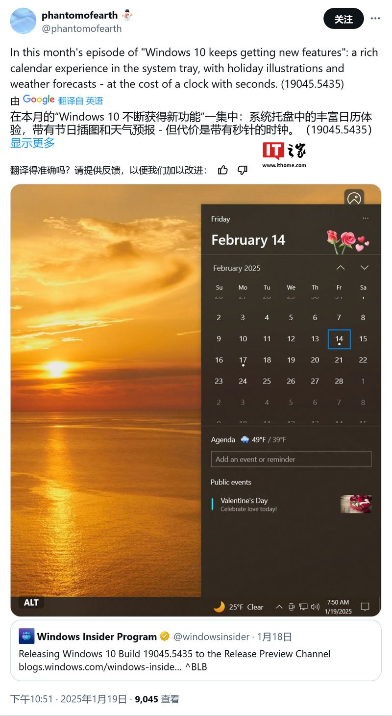 IT之家 1 月 20 日消息,Windows 10 生命周期已开始 9 个月倒计时,不过微软仍在为其添砖加瓦,在最新 RP Build 19045.5435 预览版中,为任务栏日历中添加了节日插图、天气、节假日和事件开关。