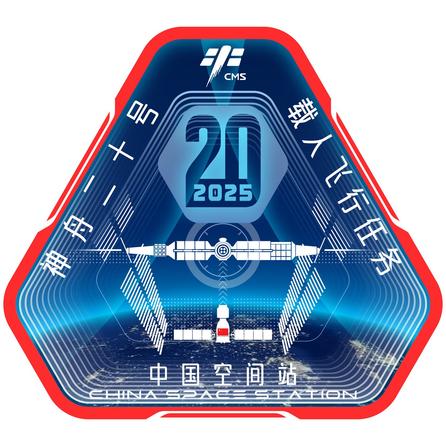 🇨🇳神舟二十号载人飞行任务标识,外框红色传承载人飞行使命,内部深蓝寓意浩瀚太空。主体神舟飞船径向对接空间站,太阳翼巧构中文“廿”字(即“二十”)。空间站亮光划破天际,彰显航天人向光前行、勇往直前的精神。