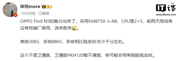 IT之家 1 月 20 日消息,一款型号为“PKH110”的 OPPO 新机昨日现身 Geekbench 跑分平台,博主 @体验more 透露该机为 OPPO Find N5 折叠屏手机。