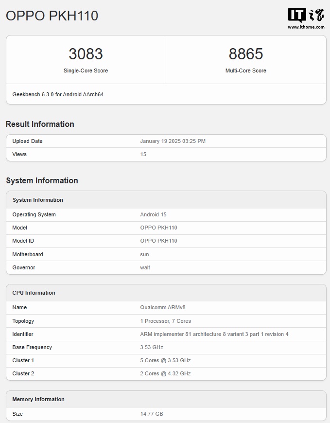 这款新机在 Geekbench 6.3.0 版本中,单核成绩为 3083 分,多核成绩为 8865 分。值得一提的是,这款新机的 CPU 为 5 Cores @ 3.53 GHz+2 Cores @ 4.32 GHz 架构,与此前曝光的 SM8750-3-AB 一致。