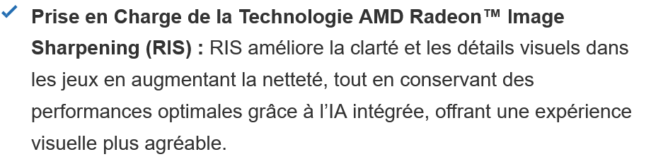 AMD 官网目前对 RIS 技术的介绍是“采用对比度自适应锐化算法”,并未提及使用了 AI 技术;此外目前版本的 RIS 技术最早支持到较早的 GCN 4.0 "Polaris" 架构显卡。
