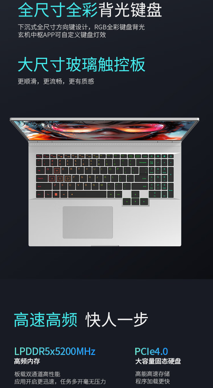 玄派玄极星 16 配备 16GB LPDDR5X 内存(5200MHz 板载双通道内存)+ 512GB PCIe4.0 固态硬盘。电脑机身拥有炫彩灯带、装配玻璃触控板 + 全尺寸 RGB 全彩背光键盘。