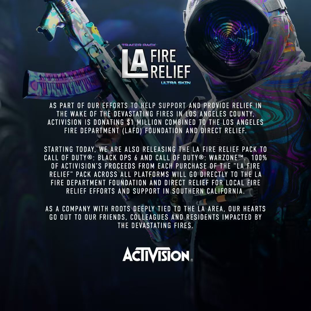 动视表示,该礼包的全部收益将捐赠给洛杉矶的救援工作,捐款将分配给两个慈善机构 —— 洛杉矶消防局基金会(LAFD)和 Direct Relief。