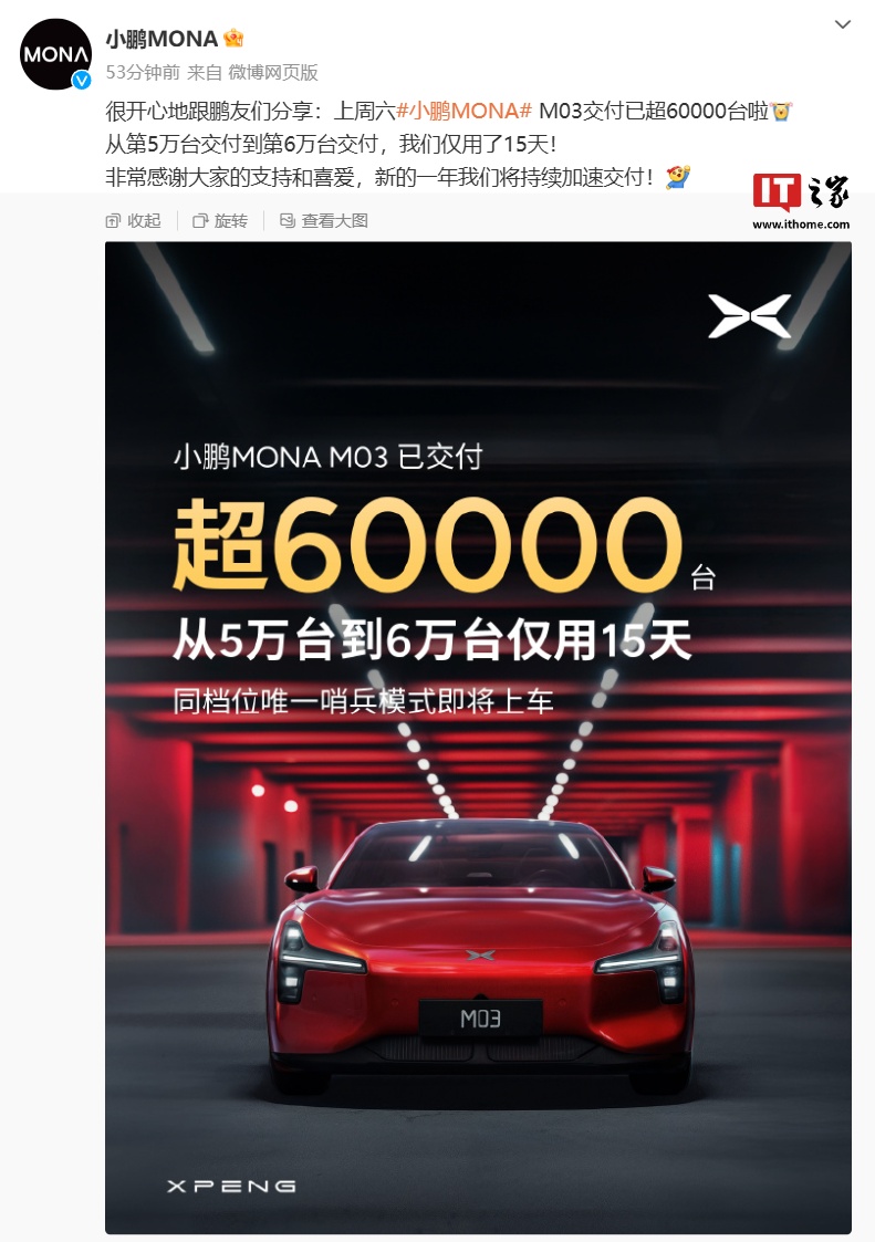 IT之家 1 月 20 日消息,小鹏 MONA 官方今日发文宣布,同价位唯一哨兵模式“即将上车”。另外,该车交付情况也同步公布:已超 6 万台,第 5 万台交付到第 6 万台交付用时 15 天。