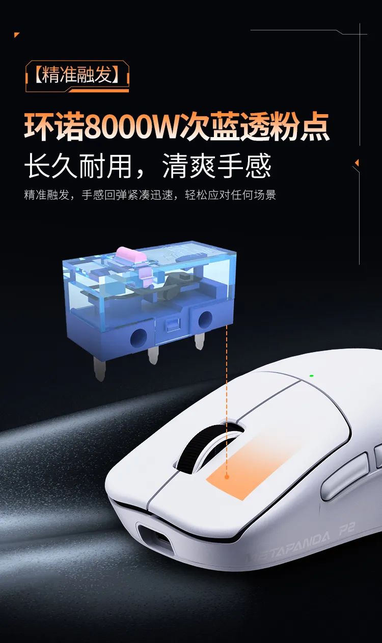 玄派 P2、P2 Pro 鼠标还搭载 PAW3395 芯片(P2 Lite 为 PAW3311),辅以环诺蓝透粉 8000W 次微动(P2 Lite 为环诺 5000W 次微动)+TCC 金 / 银滚轮(P2 Lite 为丰实卫奇滚轮)。