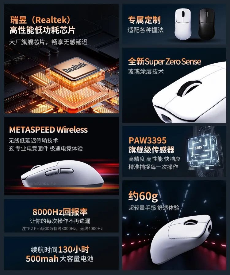 系列鼠标支持玄 METASPEED 无线传输技术 + 三模连接,P2 Pro 鼠标拥有有线 8K 回报率、2.4G 无线 4K 回报率。标准版和 Pro 款还支持最高 26000 DPI(P2 Lite 最高 12000 DPI)。