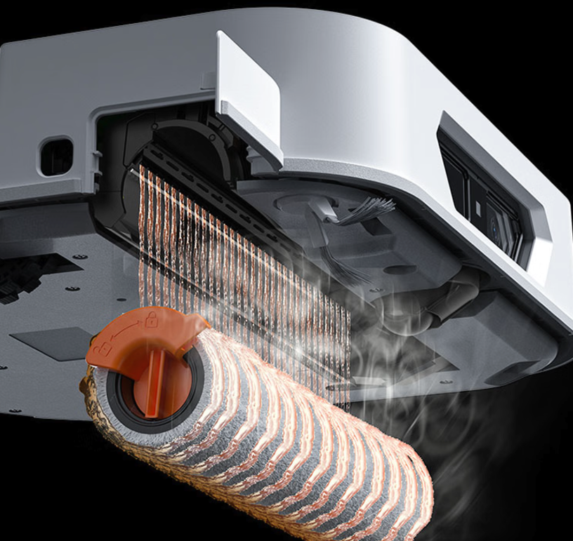 返回基站后,滚筒会自动开启自清洁模式,充分刮洗滚筒,并进行离心脱水,同时大风量实时回收污水,整个过程都在基站前侧完成,无需基站内部辅助清洁,基站始终保持洁净。而传统的扫地机器人需要在清洁完成后回到基站进行辅助清洁,再去清洁基站,这种做法不仅费时费力,还容易导致基站内部脏污难以清洁。