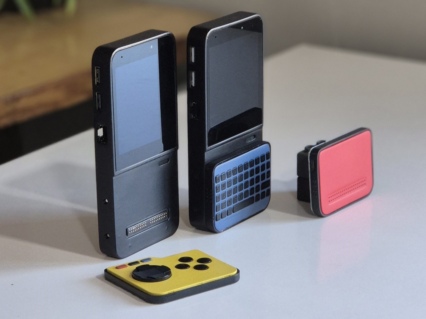 而在下方的 pogo pin 方面,Mecha Comet 官方即提供了三种模块:用于轻量级游戏的手柄、搭载 ABD 键帽的小尺寸键盘、将 40 个 pogo pin 引出 40-Pin GPIO 的转接板(也可通过底部 Type-C 连接到串行控制台)。