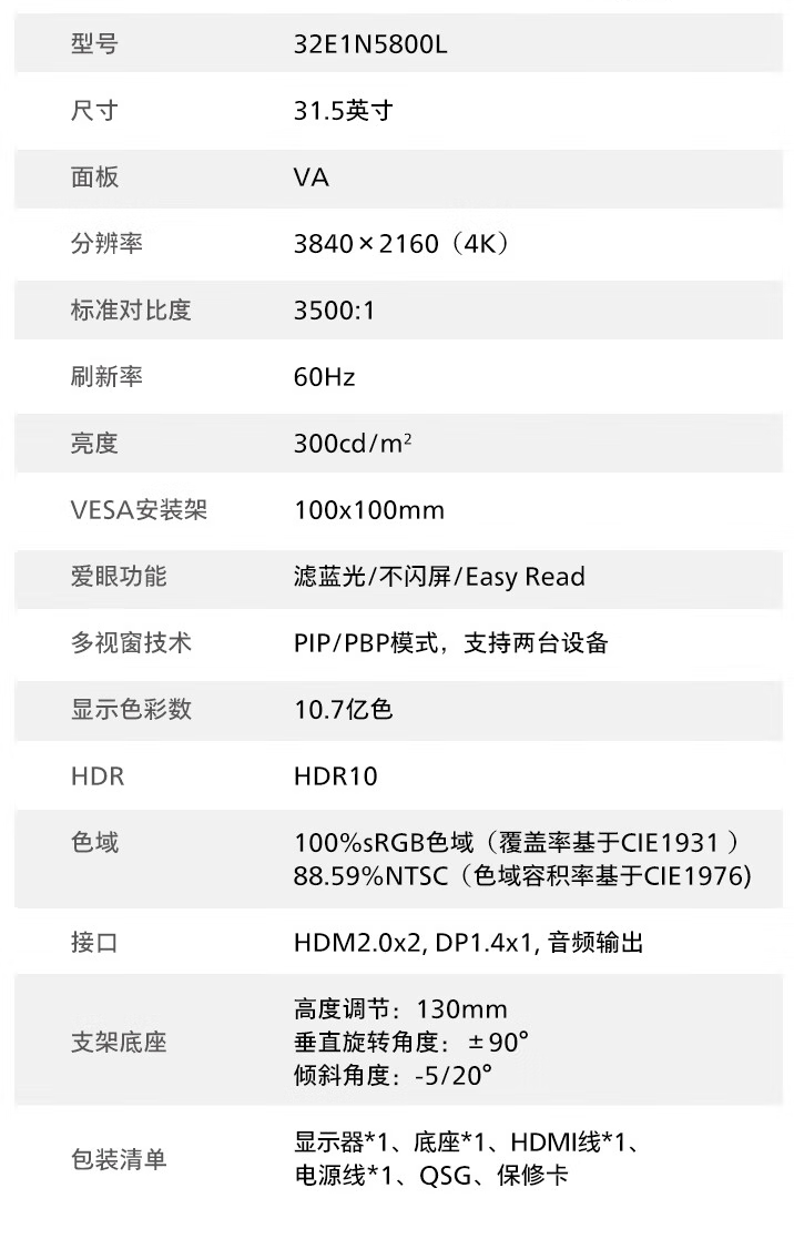 该机搭载 3840x2160 分辨率 60Hz VA 面板,亮度 300 尼特,静态对比度 3500:1,支持 10-Bit 色彩(8-Bit + FRC),覆盖 100% sRGB 和 88.59 % NTSC 色域。