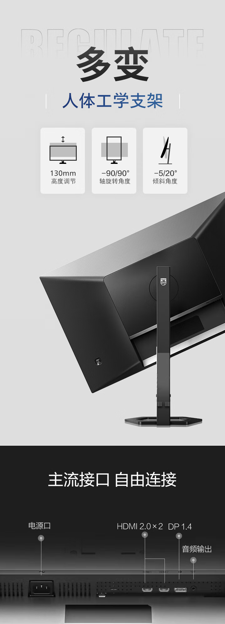 该机支架支持升降 / 倾斜 / 旋转,显示器本体支持 VESA 100x100mm 壁挂,配备 2 个 HDMI 2.0、1 个 DP 1.4、1 个 3.5mm 音频接口。