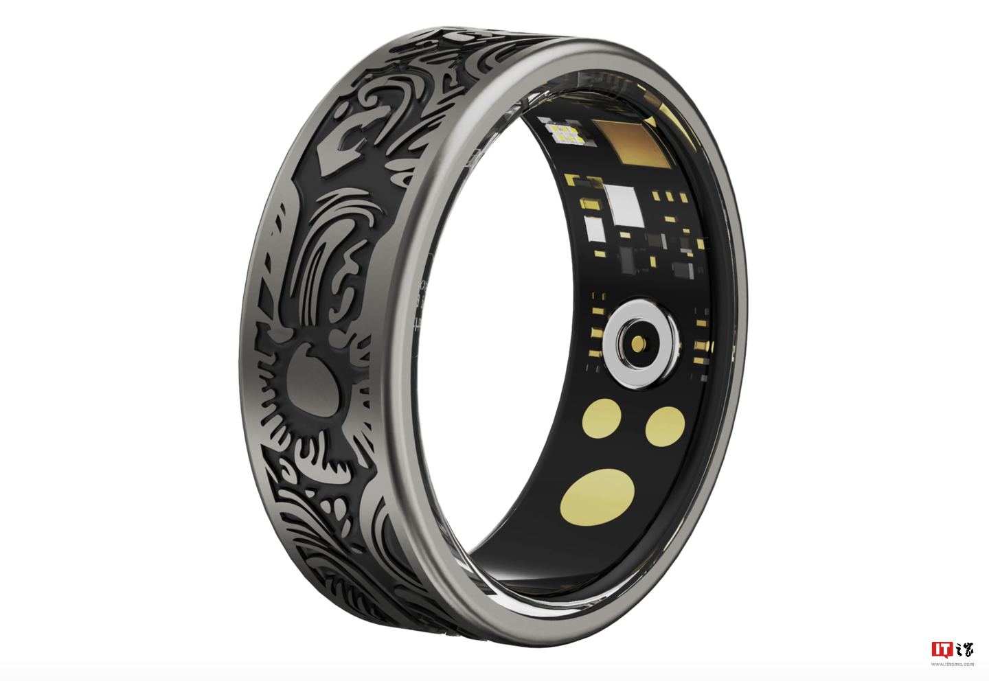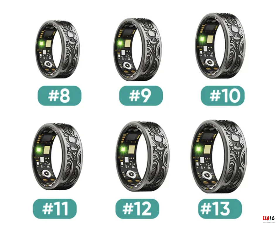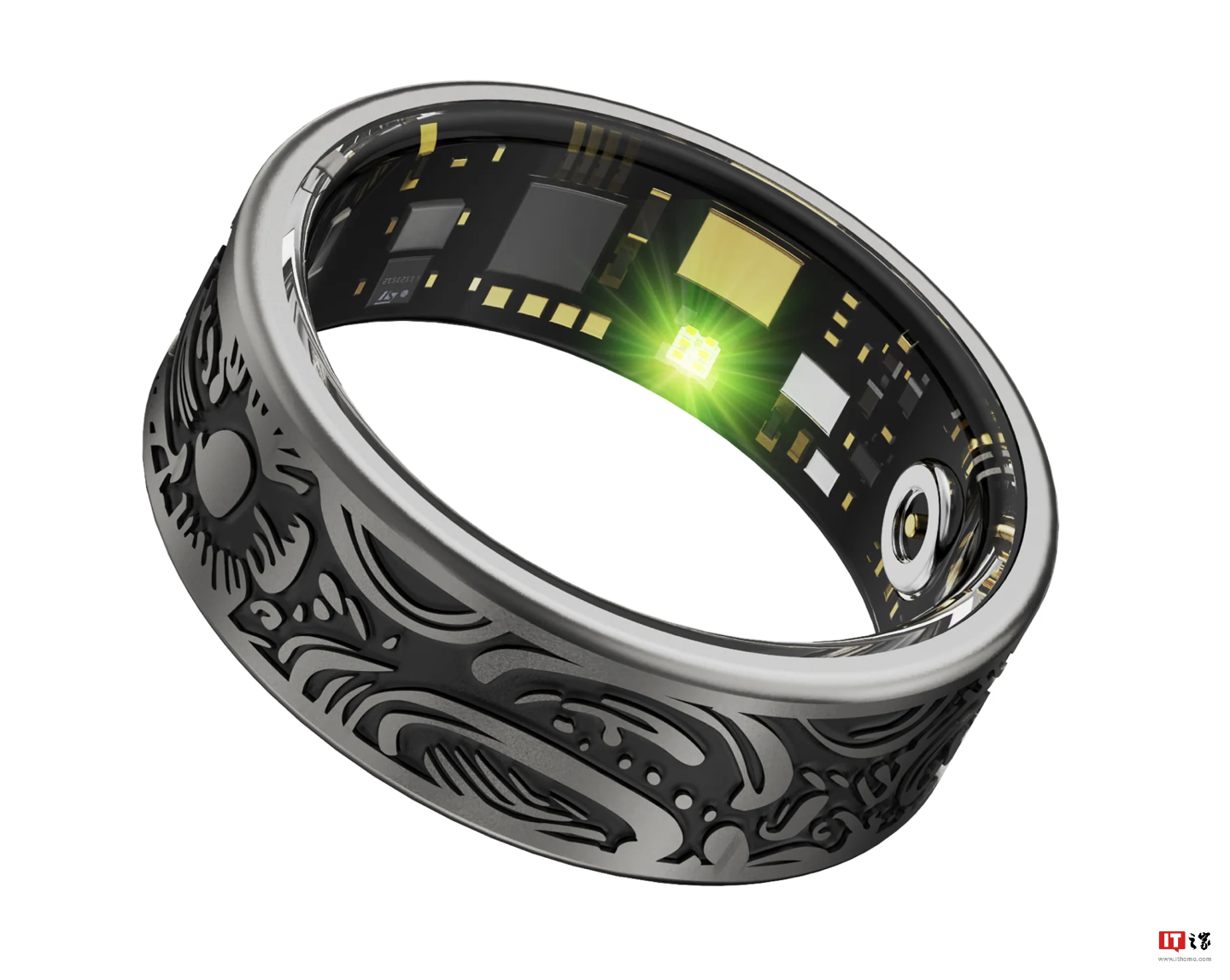 这款智能戒指外部采用钛合金材质打造,提供 6 种尺寸(覆盖 18.1-22.2mm),整体重量约 3 克,支持 50 米防水,符合 IP69K 防护,配备 20 毫安时电池,续航约 10 天。