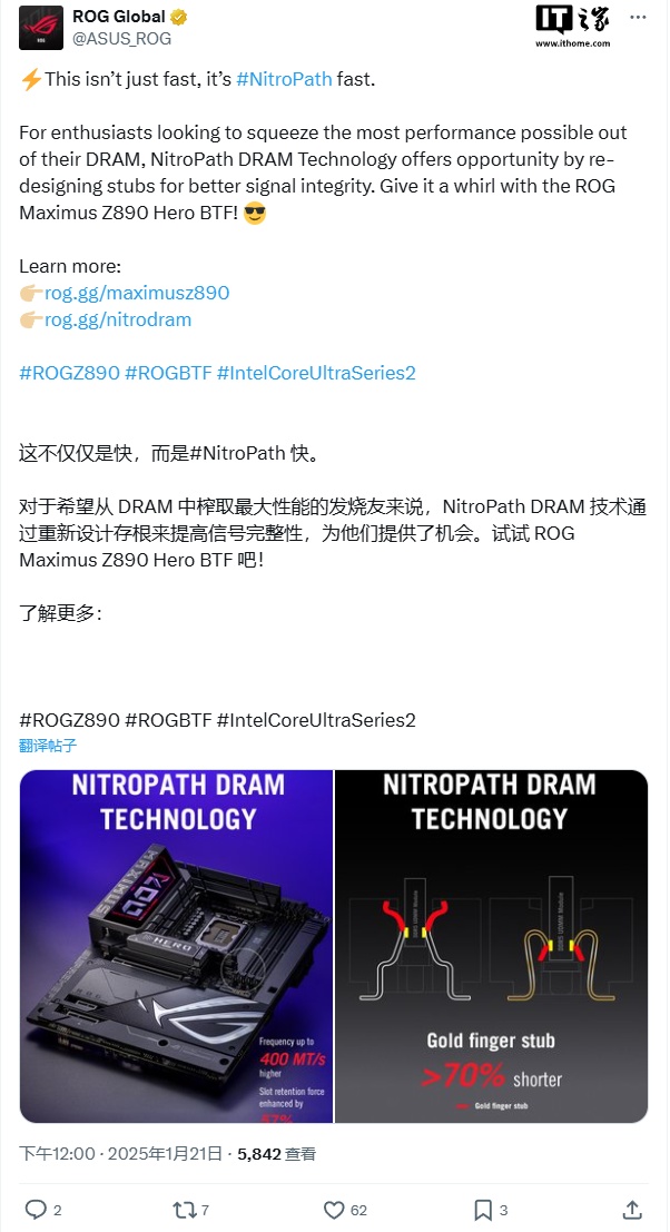 IT之家 1 月 21 日消息,华硕 ROG 官方今日展示了其 NitroPath DRAM 技术,可以理解为重新设计主板上内存插槽根部固定结构设计,从而提高内存信号完整性以及内存 OC 超频性能。