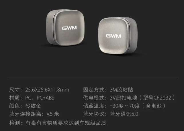 此外,该产品采用蓝牙通讯,一键唤醒;牢固粘贴在车内合适位置,随手可用;3V 纽扣电池供电,续航时间长达约 1 年。