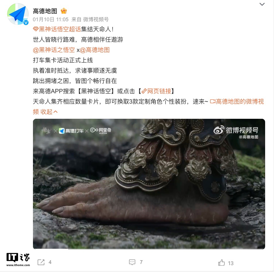 先前(1 月 11 日),高德地图联合游戏科学开启《黑神话:悟空》联名打车集卡活动,主要上线天命人、四妹和八戒三款 App 主题装扮,用户集齐相应卡片即可兑换获取相应装扮。