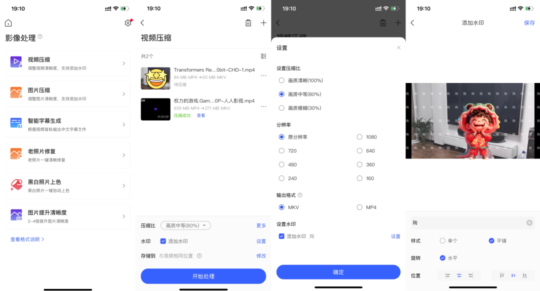 手机 App 的“影像处理”中新增视频压缩功能,支持对视频进行压缩、打上个性化水印