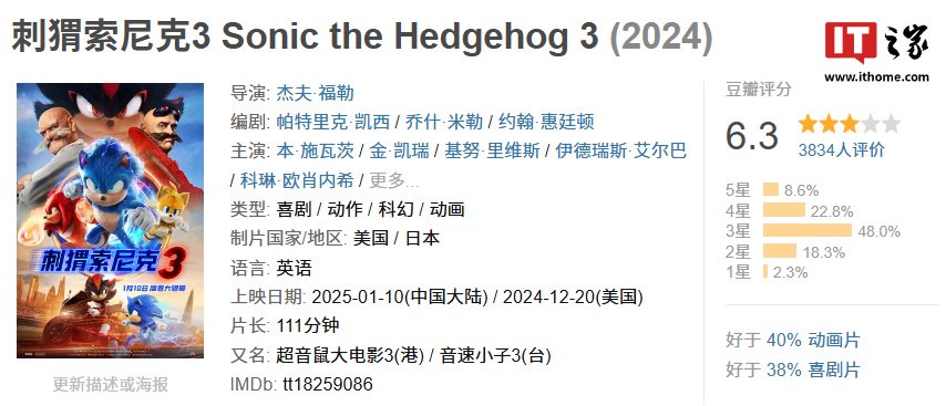 截至IT之家发稿,目前《刺猬索尼克 3》豆瓣评分 6.3 分,其中 8.6% 的用户给出 5 星评价、22.8% 的用户给出 4 星、48.0% 给出 3 星、18.3% 给出 2 星、2.3% 给出 1 星。