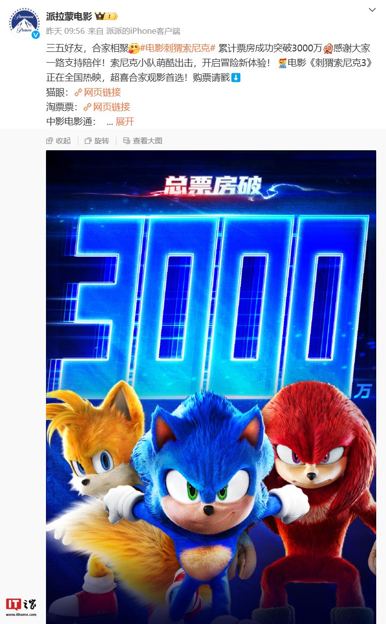 据此前报道,电影《刺猬索尼克 3》已于 2025 年 1 月 10 日在内地上映,派拉蒙影片公司官方微博昨日发文宣布,影片累计票房成功突破 3000 万。