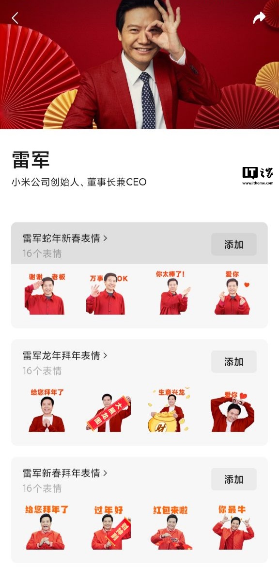 IT之家 1 月 22 日消息,小米今日上线了 CEO 雷军的蛇年新春微信表情包,共包含 16 个表情包,可免费使用。