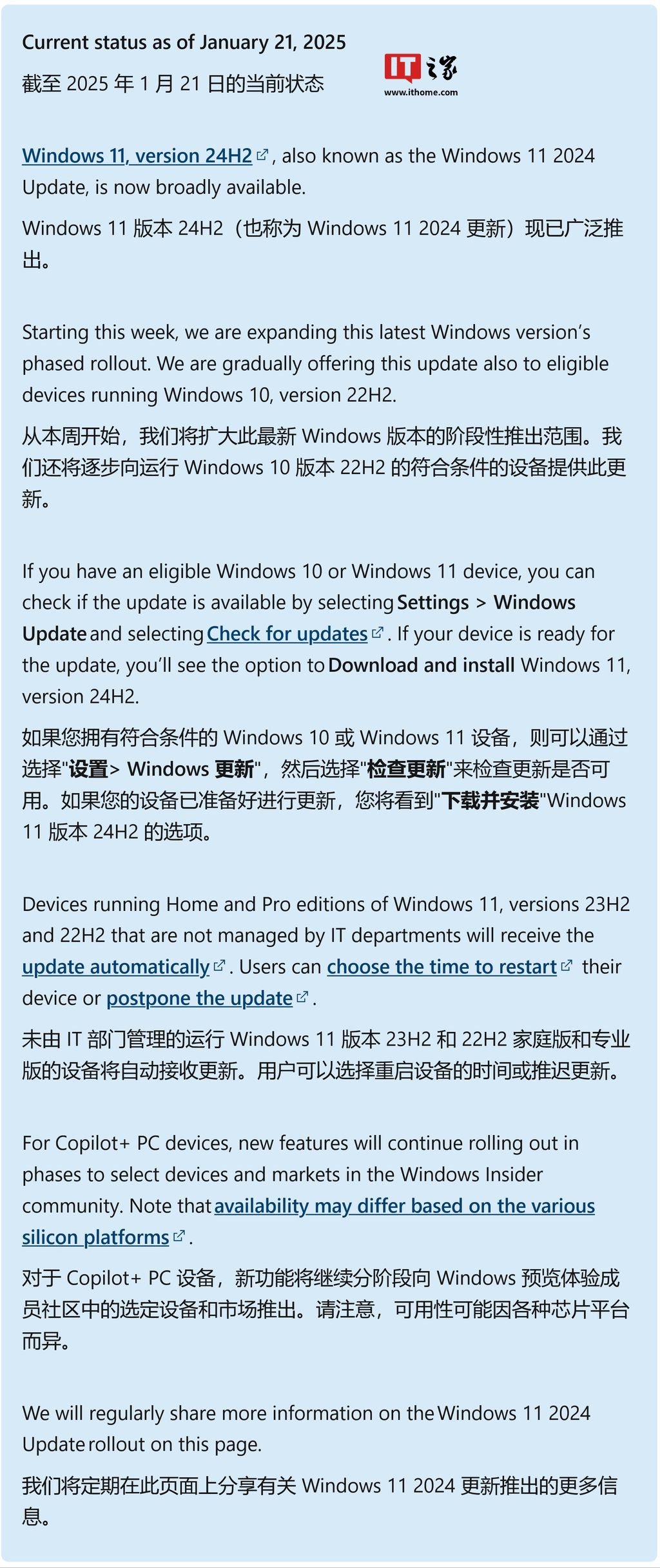 IT之家 1 月 22 日消息,微软公司昨日(1 月 21 日)更新 Windows Health 健康面板,宣布 Windows 11 Version 24H2 更新已广泛推出,意味着更多符合升级条件的 Windows 11 用户将收到强制更新推送。