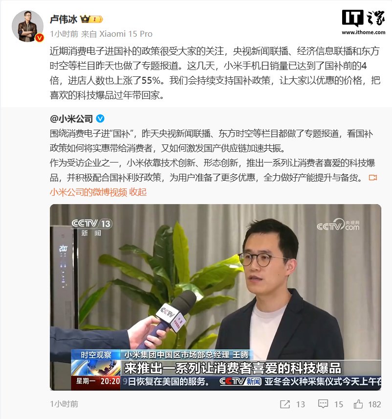 IT之家 1 月 22 日消息,围绕消费电子进“国补”,昨天央视新闻联播、东方时空等栏目都做了专题报道,其中小米集团中国区市场部总经理王腾登上央视,他表示:“在国补政策的推动下,小米依靠技术创新、形态创新,推出一系列让消费者喜爱的科技爆品。”