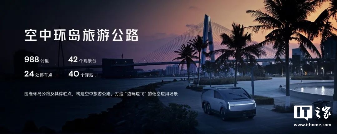 2. 示范应用阶段:打造全长近 1000 公里的国内首条飞行汽车“空中环岛旅游公路”,沿线规划 42 个观景台、24 个停车点、40 个驿站。