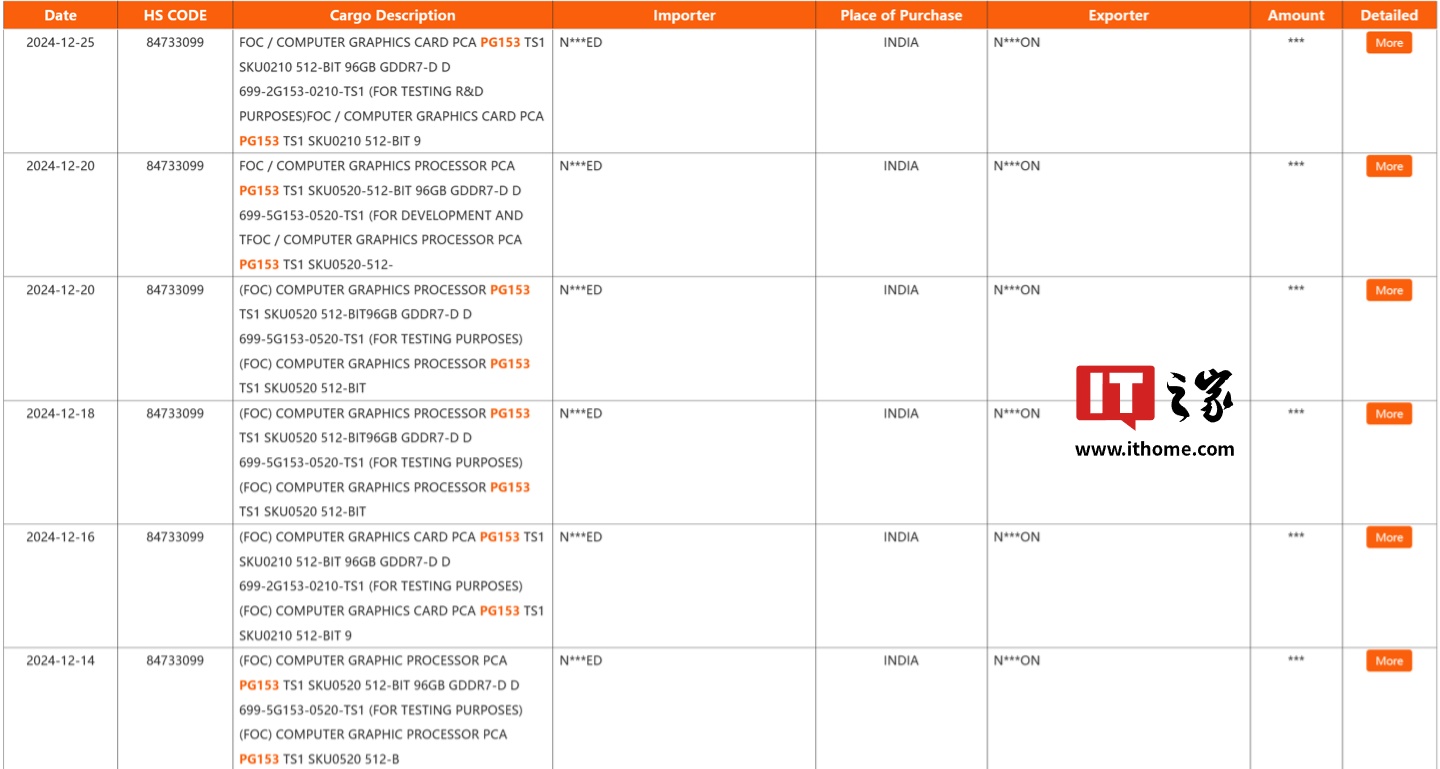 IT之家 1 月 23 日消息,X 平台消息人士 X86 is dead&back 注意到,第三方海关数据平台 NBD 记录到了六笔有关 96GB 显存显卡的数据,这些数据的时间均为 2024 年 12 月。