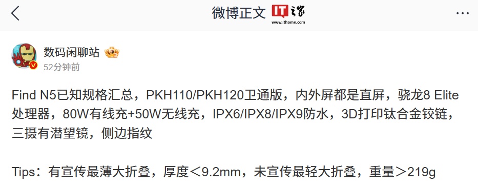 IT之家 1 月 23 日消息,博主 @数码闲聊站 今日发文汇总 OPPO Find N5 折叠屏手机配置,系列新机搭载骁龙 8 Elite 处理器,分 PKH110 / PKH120 卫通版,且内外屏均为直屏设计。
