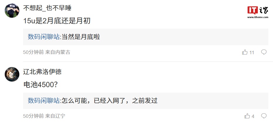 博主在评论区回复了部分网友的问题:针对小米 15 Ultra 手机发布时间是 2 月初还是 2 月底,他称“当然是月底啦”;针对 OPPO Find N5 折叠屏手机的电池容量是否为 4500mAh,他回复“怎么可能,已经入网了,之前发过”。