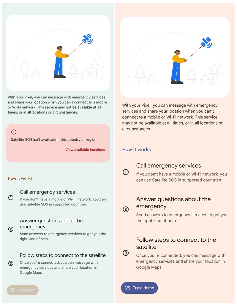 在 Beta 3 版本中,Pixel 卫星 SOS 演示功能已在英国可用,预示着该功能可能扩展至美国以外地区。