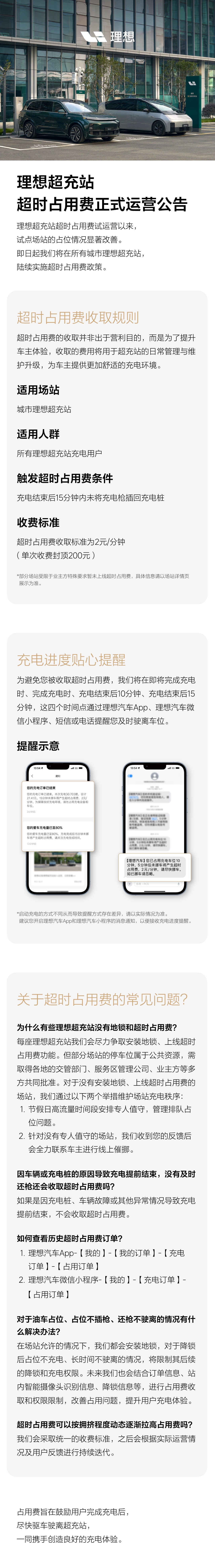 为避免用户被收取超时占用费,理想汽车会在即将完成充电时、完成充电时、充电结束后 10 分钟、充电结束后 15 分钟通过理想汽车 App、理想汽车微信小程序、短信或电话提醒用户及时驶离车位。