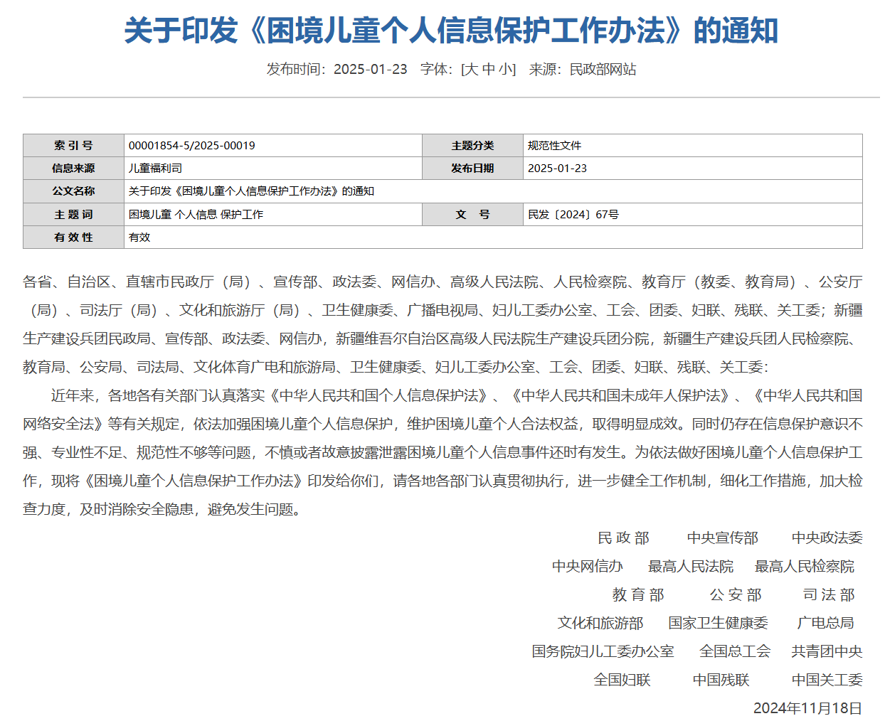 IT之家 1 月 23 日消息,为规范困境儿童个人信息使用,保护困境儿童个人信息安全,维护困境儿童合法权益,民政部等 18 部门近日印发《困境儿童个人信息保护工作办法》。