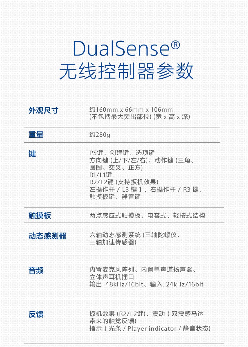 限定版手柄与标准版 DualSense 一致,整体重量 280 克,尺寸约 160x66x106mm,采用蓝牙 5.1 技术,内置 1560 毫安时电池。IT之家附参数详情如下: