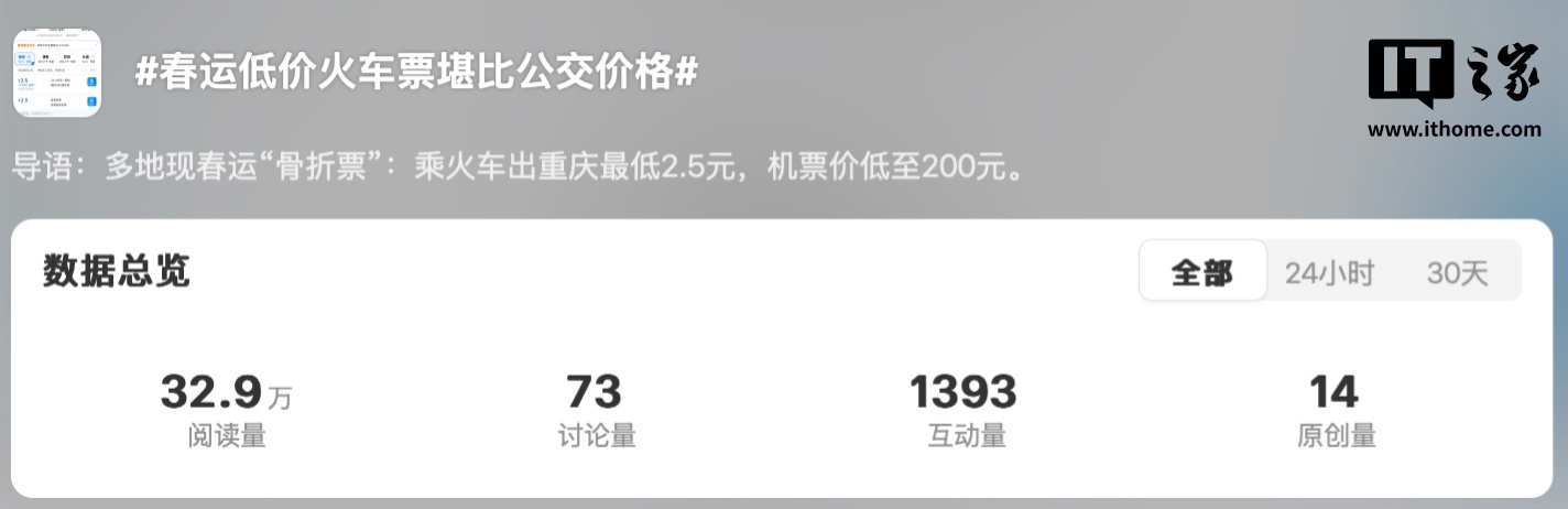 以目前较火的“2.5 元出重庆车票”为例,IT之家查询铁路 12306 综合网传截图获悉,这一车次系 K4820 次普速车,从重庆出发前往(位于四川省广安市华蓥市境内)高兴站,06:30 重庆西站发出,07:41 到达高兴站,部分日期最低票价(硬座)为 2.5 元(1.7 折优惠),不过目前这一“2.5 元票”已售罄。