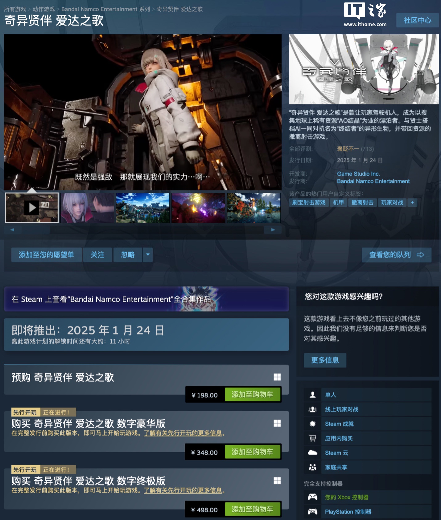 IT之家 1 月 23 日消息,万代南梦宫旗下机甲射击冒险游戏《奇异贤伴 爱达之歌(SYNDUALITY Echo of Ada)》将于明日发售,登录 PS5、Xbox Series X|S 和 Steam 平台,游戏支持简体中文。