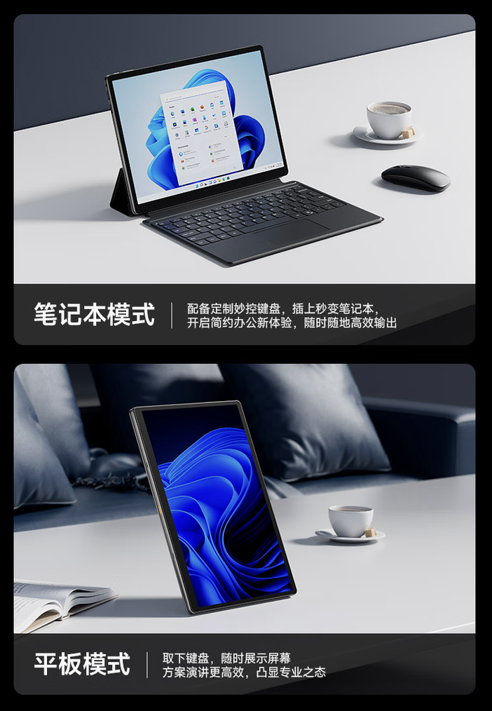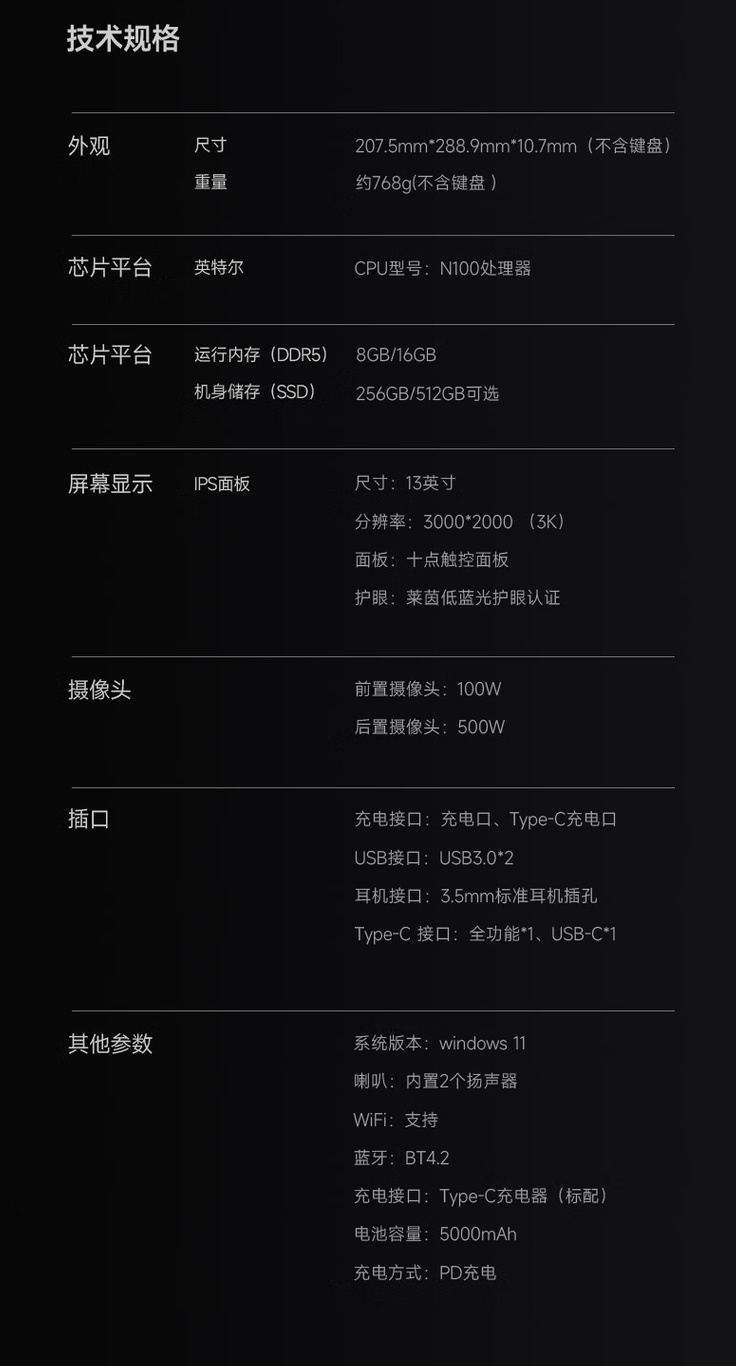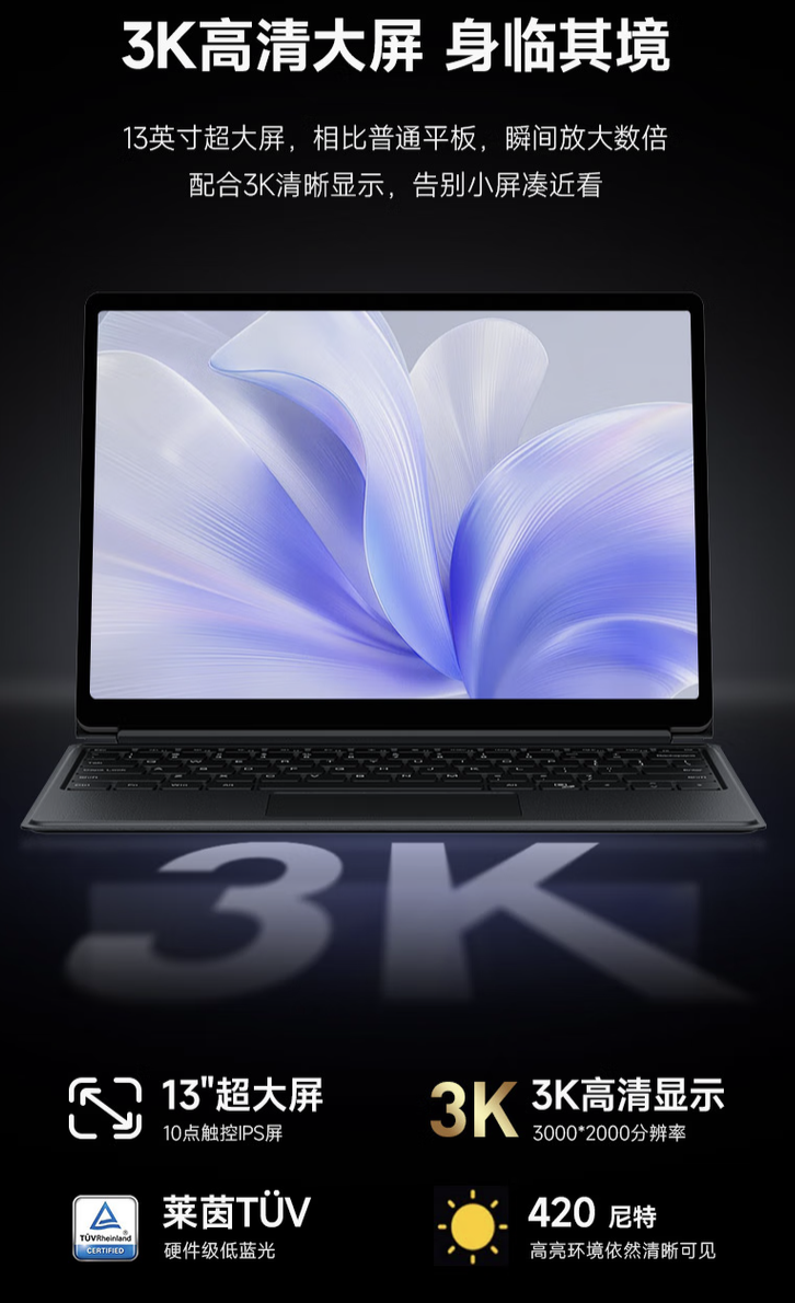 该机造型简洁,采用全金属机身,边框圆润,整体重量 768 克,厚度 10.7 毫米,正面配备一块 13 英寸 3000x2000 分辨率 60Hz IPS 面板(亮度 420 尼特),前置 1MP 摄像头、后置 5MP 摄像头,机身配备 5000 毫安时电池,标称续航 6-7 小时。