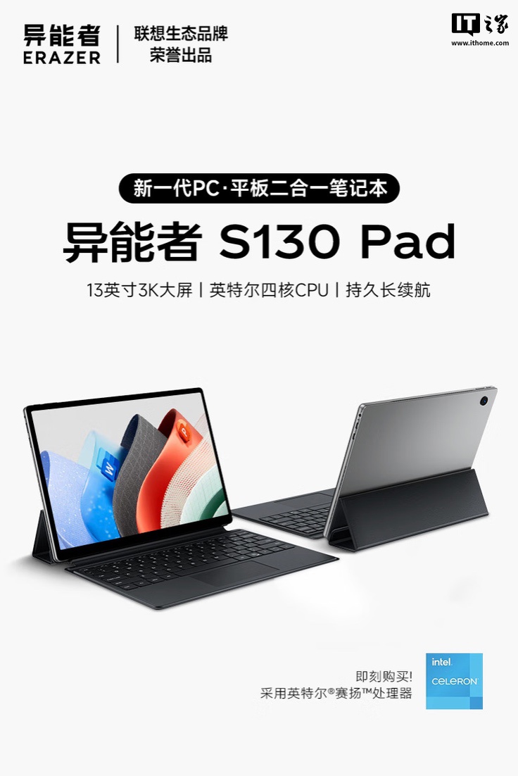 IT之家 1 月 23 日消息,联想现已在京东上架一款异能者 S130 二合一 Windows 平板,该机搭载英特尔 N100 处理器,可选 8GB / 16GB RAM 及 256/512GB 存储空间,定价为 2899 元起,IT之家整理价格信息如下: