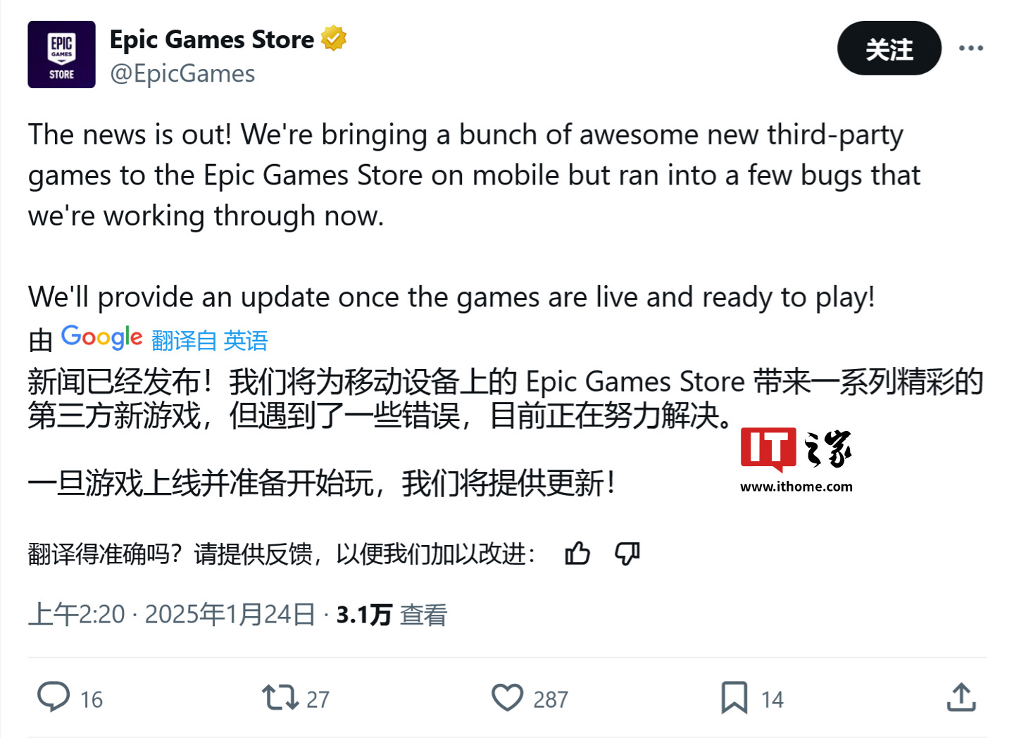 IT之家 1 月 24 日消息,科技媒体 The Verge 今天(1 月 24 日)发布博文,报道称 Epic Games 在其移动应用商店中,扩充添加了 19 款第三方游戏,并承诺承担开发者部分“核心技术费”,以吸引更多用户和开发者。
