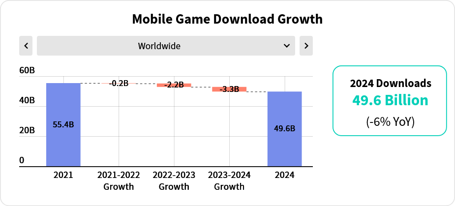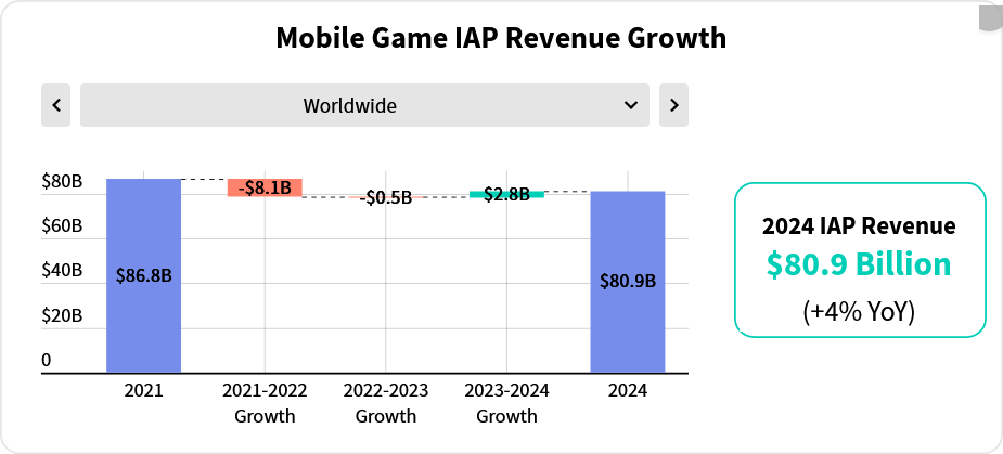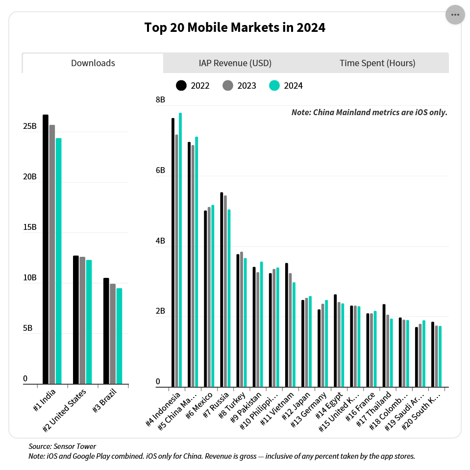2024 年非游戏应用推动了大部分增长(同比增长 23%),而游戏应用在连续两年下滑后也出现了良好反弹,增长至 810 亿美元,同比增长 4%,反映了手游市场的韧性。